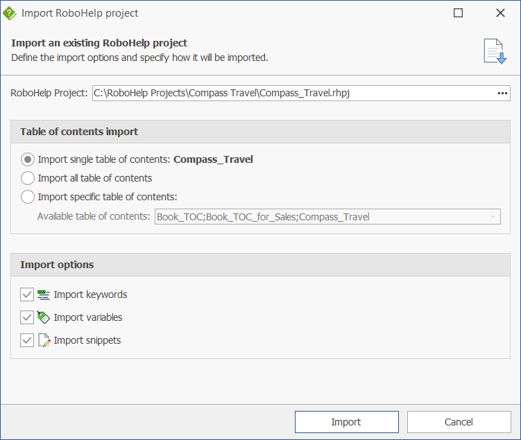 - Import single table of contents: Imports a single table of contents. For legacy projects, the default TOC is selected; for modern projects, the HTML TOC is used. The selected table of contents is displayed next to the option;