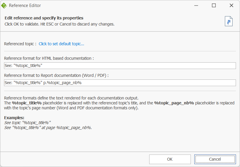 A separate report reference format is applied. In addition to %topic_title%, it can include %topic_page_nb%, which is resolved to the actual page number of the referenced topic in the final document.